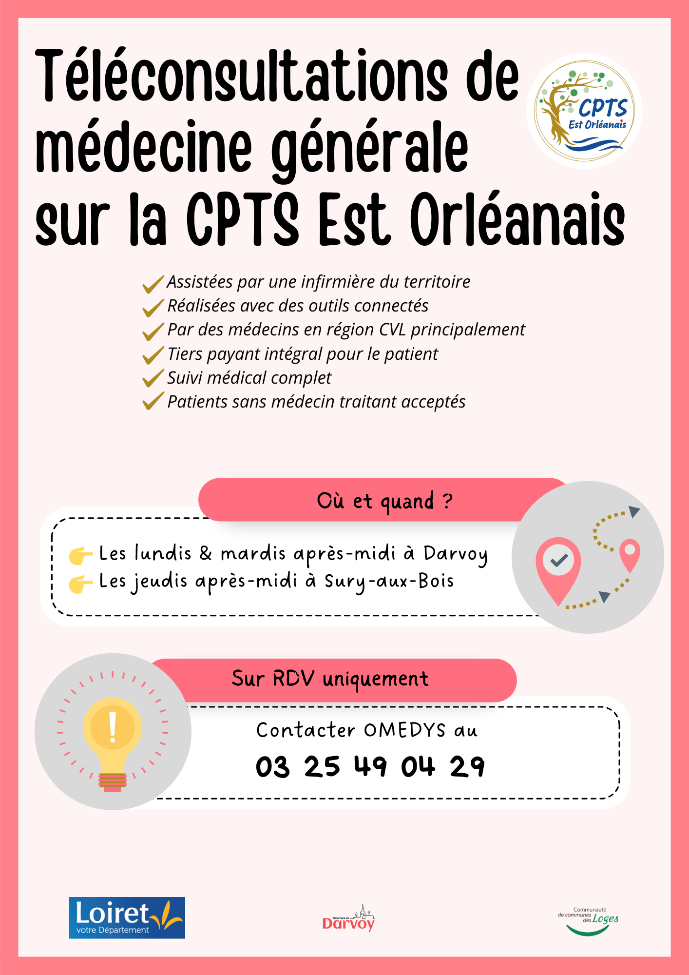 – À Darvoy, dans le Bus Loiret Santé mis à disposition par le Département : les lundis après-midi et les mardis après-midi
