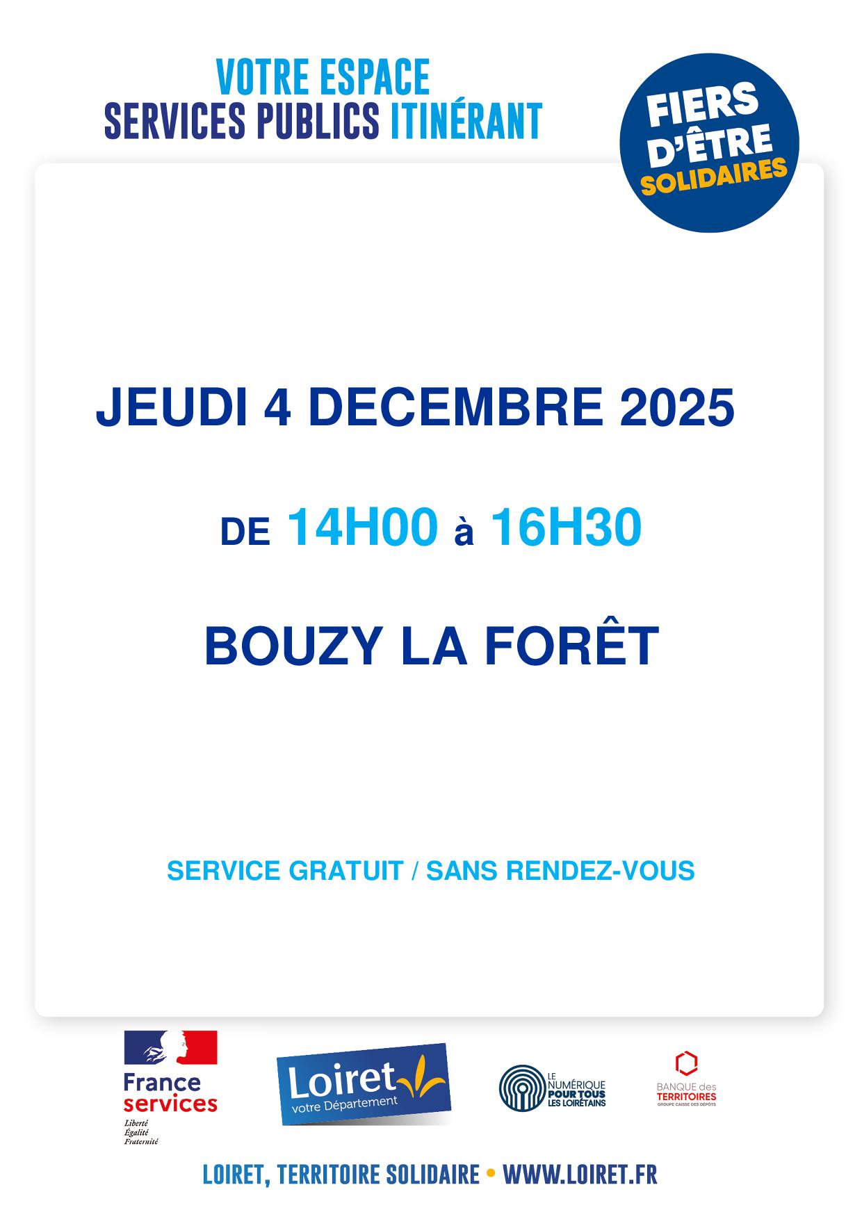 Le Bus France services sera sur notre commune le jeudi 4 décembre de 14h00 à 16h30 sur le parvis de la Salle des Fêtes.