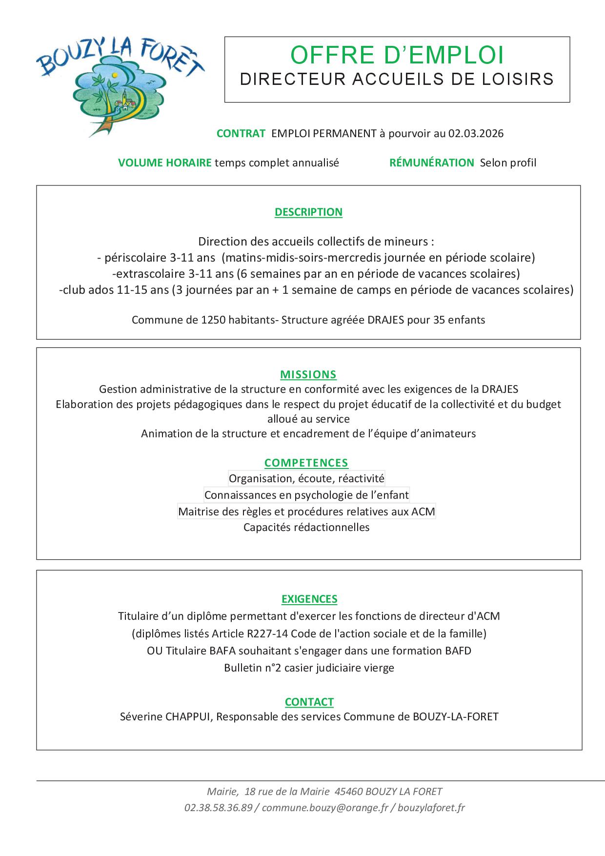 OFFRE D’EMPLOI : DIRECTEUR ACM BOUZY LA FORÊT