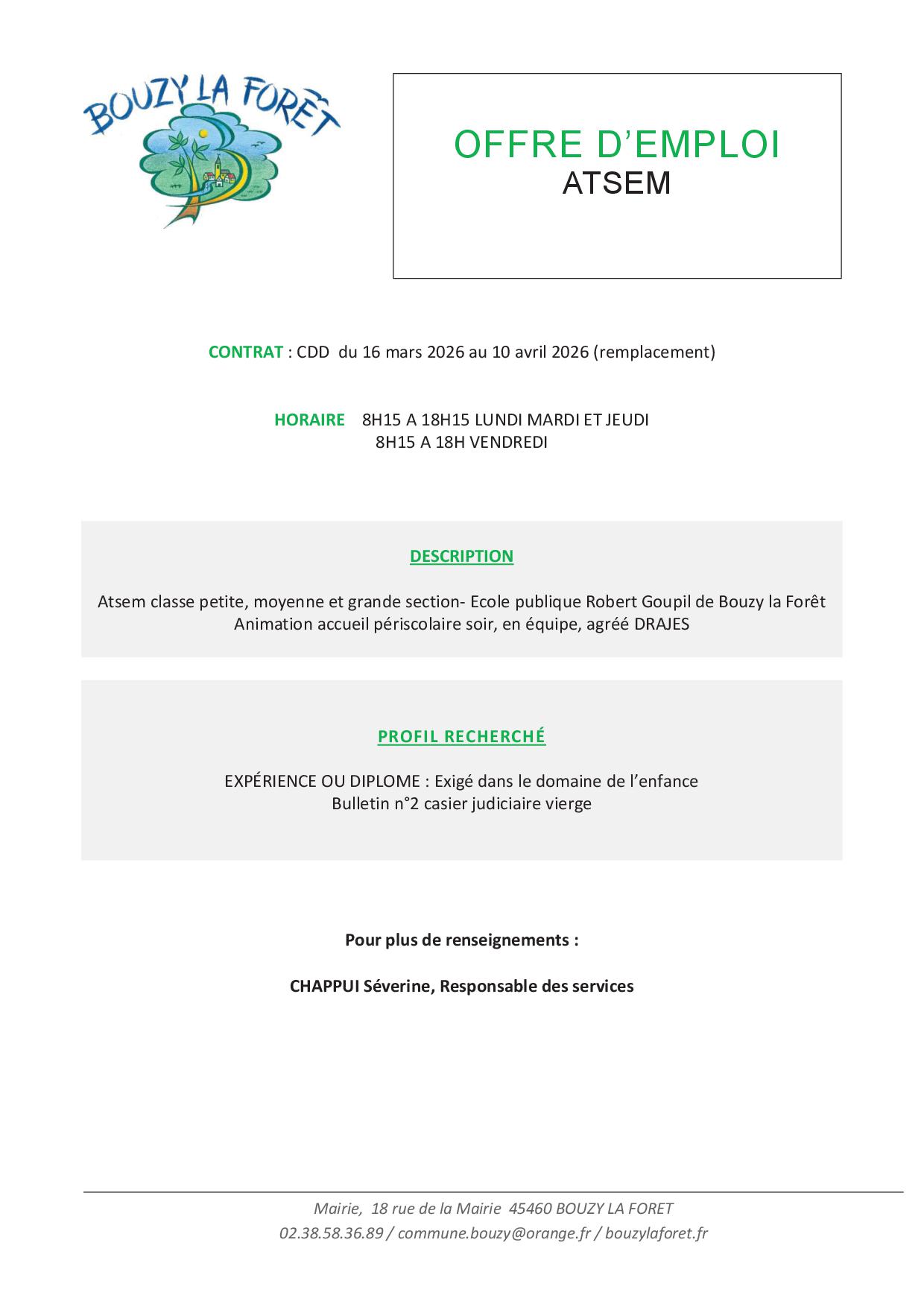OFFRE D’EMPLOI : ATSEM (Remplacement)